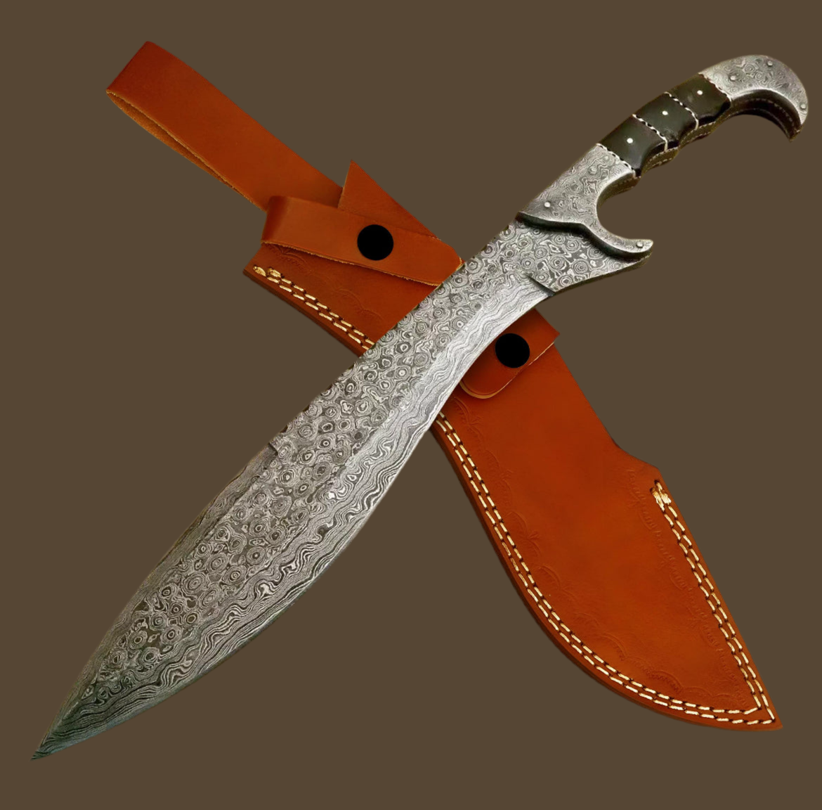 The handle is crafted for grip and control, with bold detailing that makes it as much a collector’s display piece as a functional blade. Each machete comes with a custom leather sheath, stitched for durability and ready for the field.
